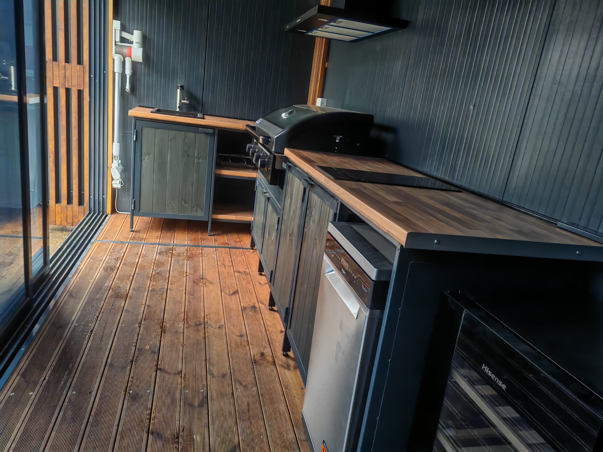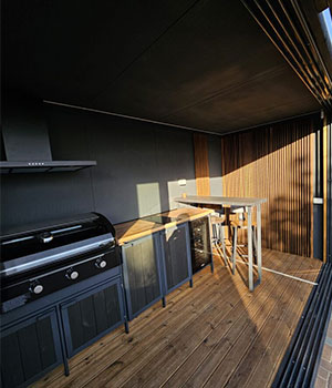 TinyBBQ este un modul complet echipat, ideal ca grătar de grădină modern: include grătar pe gaz, spații de depozitare, blat din lemn, chiuvetă, opțional plită, frigider și zonă de bar.